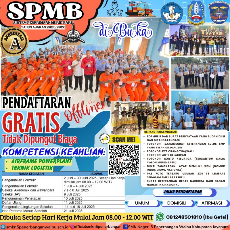 Pelaksanaan Seleksi Penerimaan Murid Baru (SPMB) SMK Negeri 5 Penerbangan Waibu Kabupaten Jayapura Tahun Ajaran 2025/2026 dibuka pada tanggal 1 s/d 10 Juli 2024, seluruh kegiatan dilaksanakan secara luring.